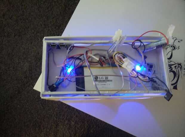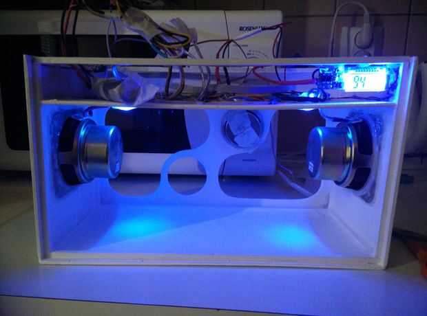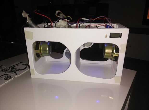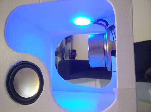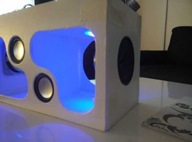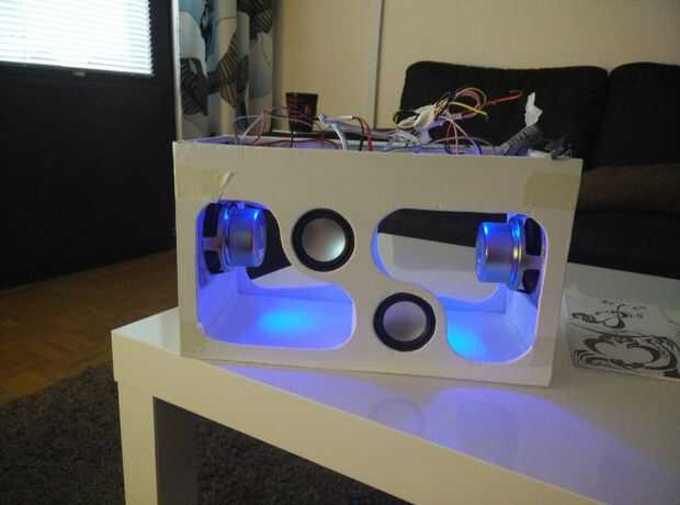 Ya tengo el diseño básico de la caja donde lo quiero ser. Frente y parte posterior de la caja tiene agujeros para windows acrílico para que pueda ver los altavoces dentro junto con el LED azul frío. Utilicé un trozo de espuma blanca para difundir los leds porque le dieron un poco de un foco áspero sin la espuma. También incluye un esquema simple para el amplificador pam8403 y añadir a una guía de cableado completa una vez que he descubierto todo. La caja funciona como está ahora, pero voy a hacer unos cambios más adelante.