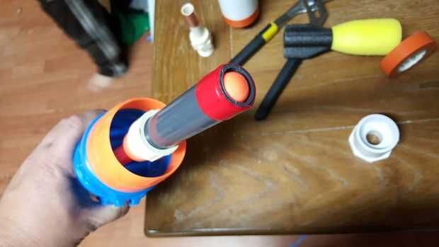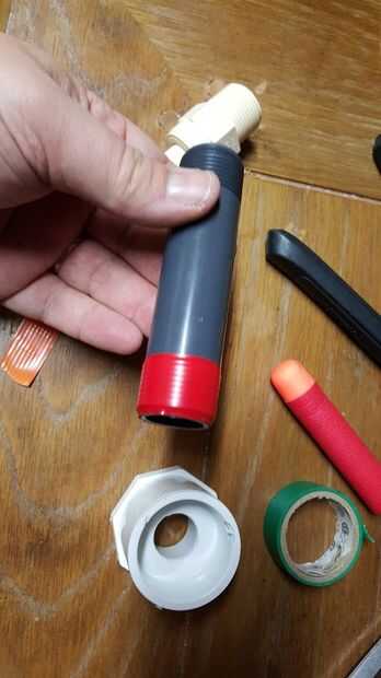 Este es el cañón más fácil. Simplemente atornille un 3/4 "x 4" de gris pvc rosca niple de tubería en su blastzooka. Estas tuberías caben muy bien los dardos de la mega (dardos nuevo será muy apretado, pero después que han sido muchas veces, se deslizan en muy bien) envuelve el extremo abierto del tubo en cinta aislante roja. Esto cubre las roscas expuestas (puramente estéticos) y enlaza con el esquema de color rojo/gris nerf mega