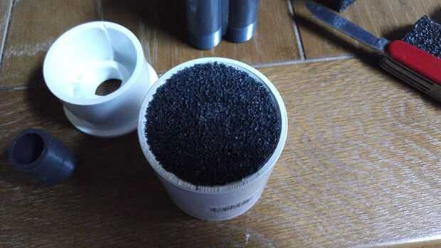 Cortar un trozo de espuma que llena a la mitad del acoplador de 2". (utilicé un trozo de espuma de un viejo PC envío caja. no tienes que hacer esto, pero es necesario rellenar en una gran cantidad de espacio muerto aquí, de lo contrario tomaría un montón de pegamento caliente.