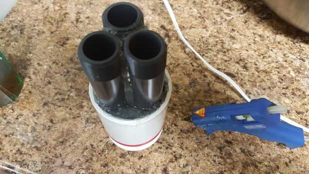 pegamento en su lugar con pegamento caliente. Si no, la presión de aire soplará el conjunto del barril el acoplador. Sellar con un montón de pegamento caliente para que el aire no puede escapar alrededor de los barriles.