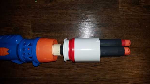 esto es algo realmente fresco y fácil de hacer si tienes una super soaker máximo 6000... solo abrir se saca el recipiente del agua y la punta de la nozzel, hacer un agujero más grande en el secundario nozzel luego suba poner dardos en cada extremo...
