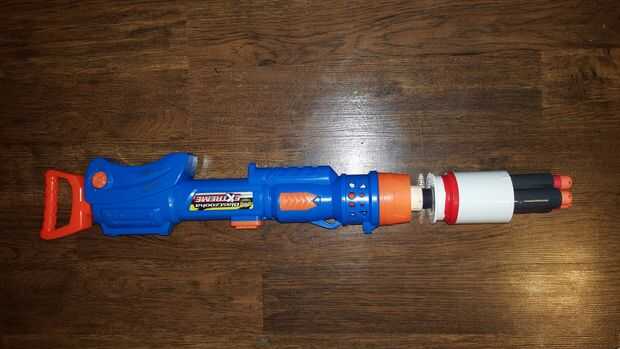 esto es algo realmente fresco y fácil de hacer si tienes una super soaker máximo 6000... solo abrir se saca el recipiente del agua y la punta de la nozzel, hacer un agujero más grande en el secundario nozzel luego suba poner dardos en cada extremo...