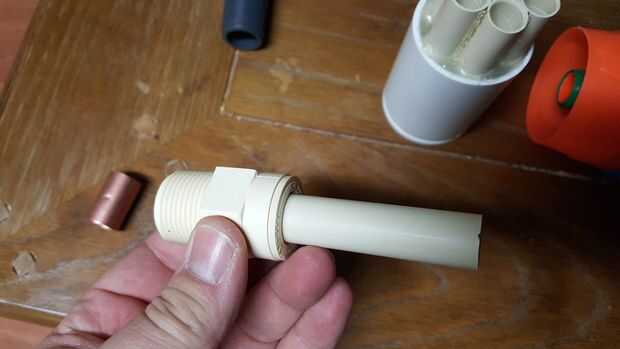 Inserte el conjunto buje/barril en el resbalón de cpvc de 3/4" apto rosca adaptador macho. Péguelo con cemento de PVC.