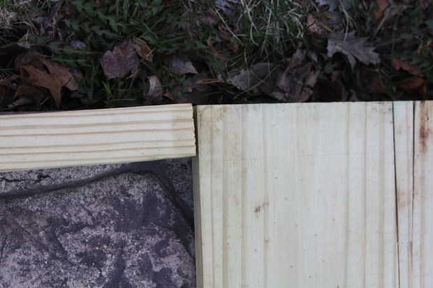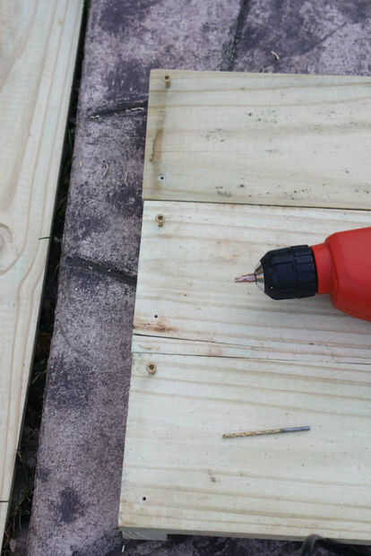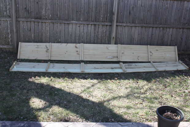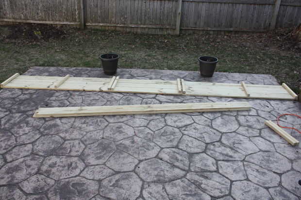 Seis de lo 1,25 "x 6" cortar en pedazos de 5 pies, les tope contra seis pie 8 piezas creando los lados dos 13 pie requeridos por el diseño. Las restantes seis piezas de sobrecorte de 3 pies (de la madera de 8 pies en la última frase) fue emparejado con tres cortes de 6 pies adicionales para producir los lados dos 6 pies. Todos estos se unieron con siete cortes de 1,5 pie de 1 "x 1" en los lados largos (véase el cuadro) y dos cortes de 1,5 pie de 1 "x 1" en el lado corto con tornillos. Se perforaron agujeros guía antes de atornillar todo juntos para evitar que se resquebraje la madera.
