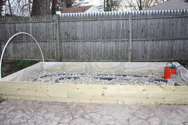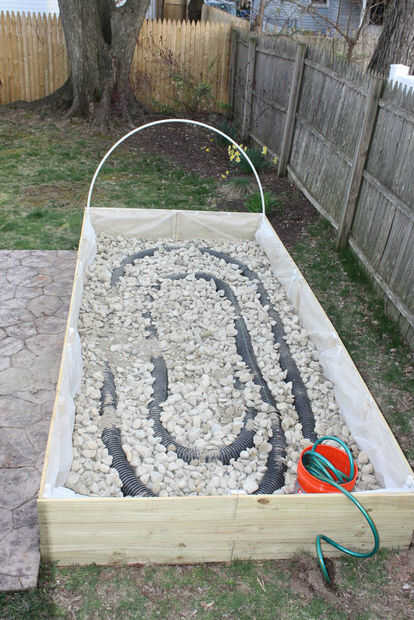 Una vez que la caja está forrada, es hora de instalar el depósito. He elegido para tener una reserva de 6" de alto, que permite un 5" diámetro tubo de irrigación distribuir el agua y el río piedras para apoyar el suelo anterior y permitir que el agua se disipe a través de todo el lecho de jardín. Las rocas hacen que el suelo no es que se filtra en el agua, que puede ser perjudicial para las raíces de la planta y causar la proliferación de bacterias dañinas y hongos. Rocas de río no son su única opción aquí, sólo pasan a ser abundante y barato para mí debido a mi proximidad a Río de Delaware, he visto otros utilizar conchas, cáscaras y rocas de lava (piedra pómez) la tuerca sólo con éxito.