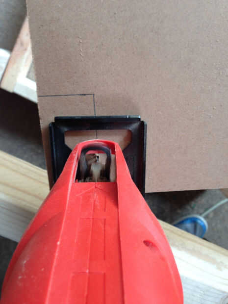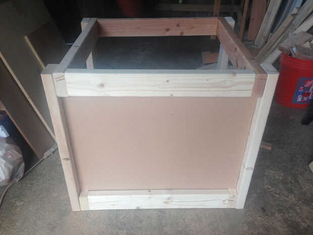 Como los paneles laterales, puede decir de las fotos de arriba que construí para sentarse en el interior de la estructura de 2 x 4 en lugar de fijarse en el exterior. Esto fue hecha para acomodar el revestimiento perforado y la plataforma extensible de mesa que instalaremos más adelante. Como tal, desea que sus paneles laterales que corte tan ajustado como sea posible, de lo contrario habrá huecos entre el marco y los lados de los paneles. También, puede que necesite quitar temporalmente los apoyos del centro de la parte superior e inferior del marco para permitir un fácil acceso al interior de su mesa de trabajo.