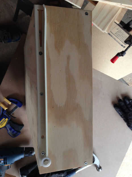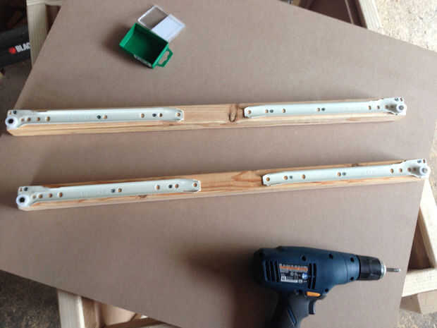 Basado en la anchura de mis cajones y el espacio entre mis dos paneles laterales de la estructura de UMW, determiné que postes de 2 x 2 (que son realmente más como 1.5" x1.5" pernos prisioneros) daría el ancho perfecto para asegurarse de que mis cajones se sientan en la posición precisa para no ser interferidos por el marco. Yo corte dos 2x2s a 28" y siguió adelante y unida a la otra parte de las correderas a ellos, asegurándose de que las diapositivas tope contra el borde delantero de los montantes exactamente.