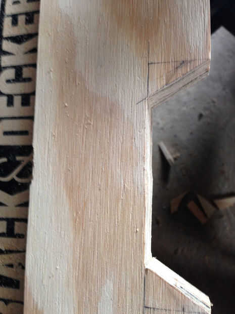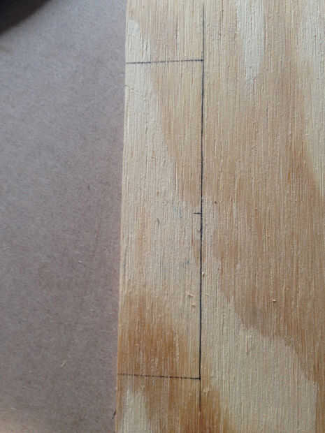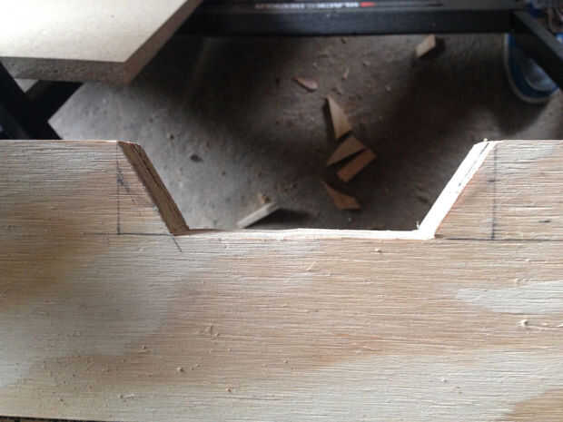 En lugar de colocar una manija del cajón o perilla que interfiera con las puertas vamos a añadir más tarde, que decidí cortar una hendidura en la cara de cada cajón que le permitirá tirar abierto. Sólo que lo componen como fui, encontrar el punto medio de la frente de la gaveta (9,25") y mide 2.5" hacia fuera en ambas direcciones. Marcando estos puntos y mide una pulgada hacia adentro del borde, sacó una caja donde se sentará la ranura. Entonces dibujé una línea a unos 30 º desde los dos puntos exteriores de la ranura. Usando una sierra de calar, cortar esta nueva forma trapezoidal que servirá como la ranura del mango. En este punto, usted puede seguir adelante y pulir todos los paneles de sus cajones, redondeo de los bordes en la cara del panel para mayor seguridad.