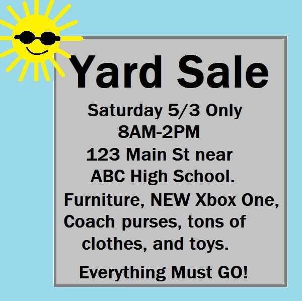 Anuncios de periódico son corto y dulces. Sólo necesita publicar su dirección, fecha, hora,y destacar una o dos cosas para animar a la gente y para ayudar a diferenciar la venta de otros en ese día. Tuve una Xbox una consola nueva y monederos Coach para resaltar mi venta. Suyo puede ser precios, toneladas de muebles, venta móvil o coleccionismo.