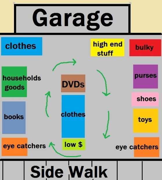 4. Coloque las prendas grandes llamativas en la parte delantera, cerca a la calle. Puse mis 2 carros portátiles en el frente y 2 vacíos, un equipaje y una cuna plegable portátil. Seguir moviendo cosas para sustituir a éstos como venden también.