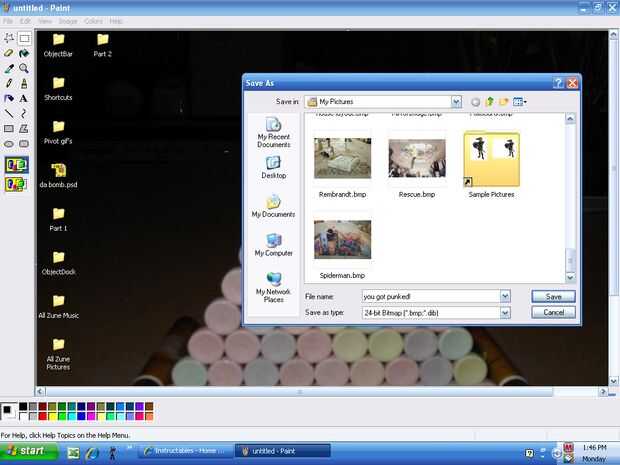 luego abrir paint (o lo simple foto software de edición tienes) luego ir a editar - pegar. Aquí está la parte importante no cambios cualquier DEMENTIONS o cualquier cosa. ir a archivo--guardar como--fotos--(salvo que como el lo cada que quieras) .bmp--guardar
