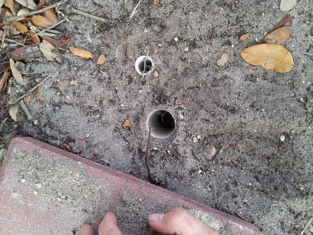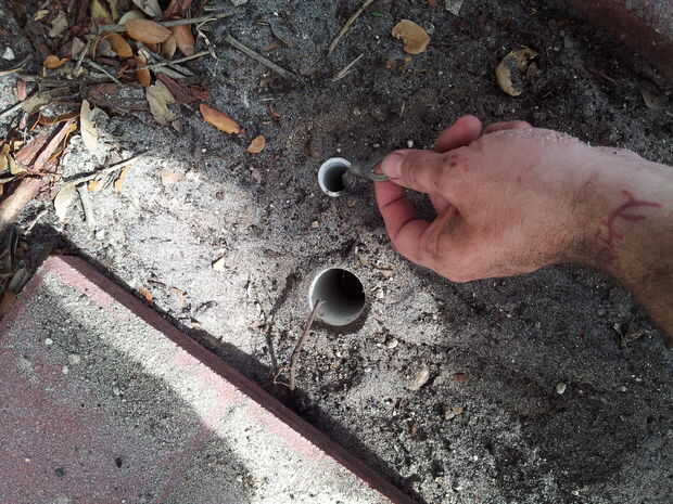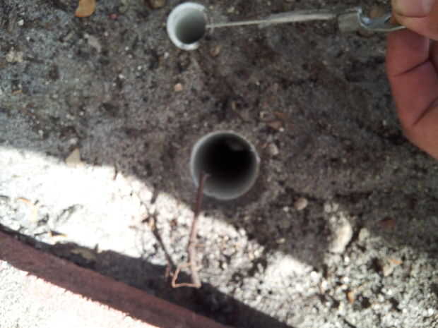 Tenemos que enterrar completamente la sección central de PVC, de todos modos debe ser más corta que las otras 2 piezas. La tubería principal de PVC debe venir bien a la superficie o posiblemente 1/4 pulgada debajo de la superficie. El tubo de PVC de diámetro más pequeño debe ser justo debajo de la superficie, con la cadena de tirón "anillo" no visibles pero de fácil acceso desde la superficie.