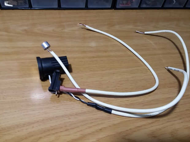 Soldar un par de cables en el disco piezo, el positivo va hacia el área gris, mientras que el negativo consigue soldadas al disco, puse el disco sobre una servilleta húmeda para evitar el sobrecalentamiento, entonces pegué un mando con epoxi. Usé algunos hilos con que tenía puesta alrededor de la tubería, que realmente quiere el cable que en un tubo de plástico o tela, ya que las vibraciones en el cable Haz transmitidas para el piezo y afecta la calidad del sonido recibido.