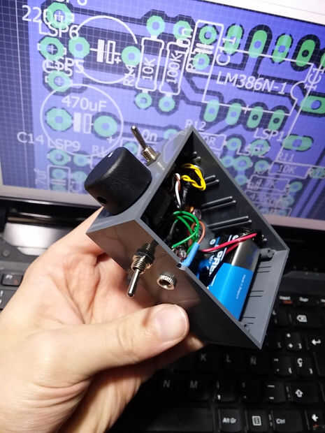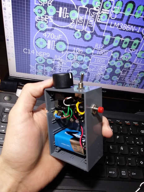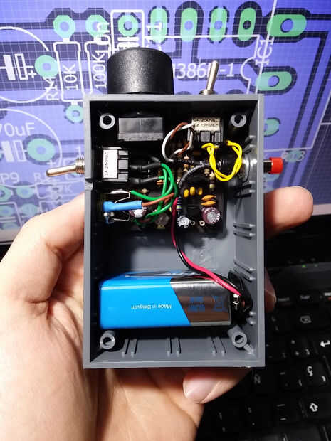 El circuito se embala firmemente en la caja y los interruptores, potenciómetro y jack se jodan a los lados de la Junta.
