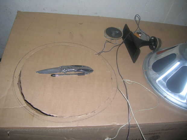 ver el altavoz y la estimación de cuánto de un compromiso necesita (es decir, la parte que necesita para descansar en la cartulina) para apoyar el orador, en mi caso tuve la mitad de una pulgada de cono cartón soporte del altavoz así que dibujó una línea más o menos media pulgada dentro de la línea original y cortar un círculo