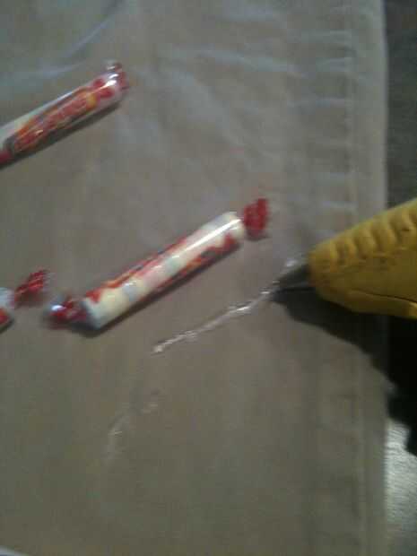 Pegamento el Smarties para los pantalones. Asegúrese de obtener una sujeción firme (o bien puede perder algunos)