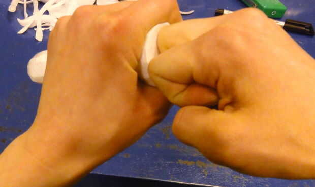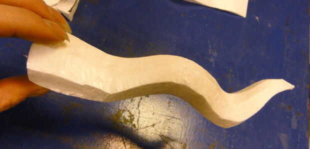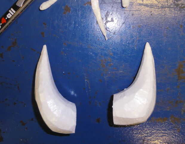 Una vez lograda la forma deseada, presione un poco en los fondos de los cuernos. Esta abolladura les ayuda a sentarse más al ras en la frente por lo que el adhesivo tiene un mayor área de contacto.