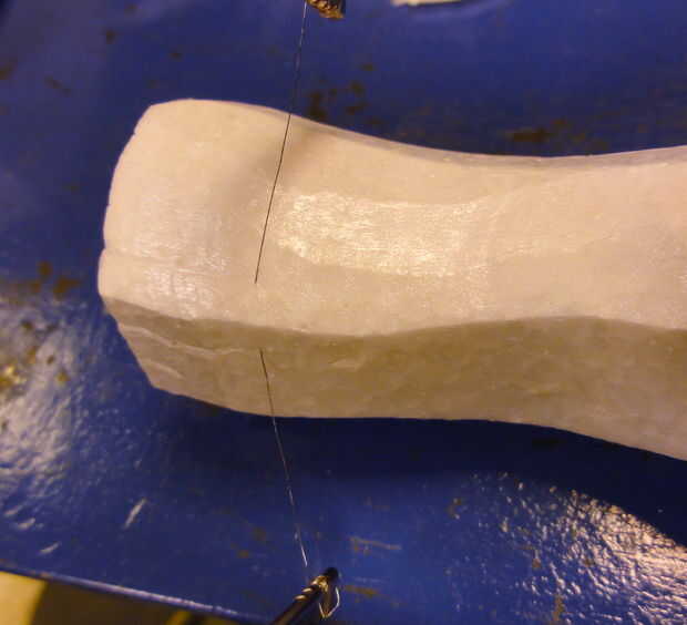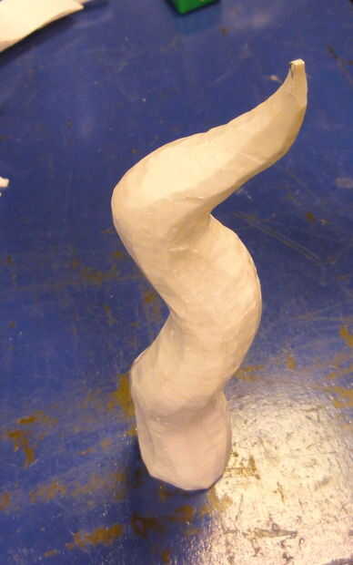 Miradas de squareish y bloques y no muy naturales, ¿no? Momento de comenzar a formarlo. Corte a lo largo de cada borde para ir de una plaza a un octágono. Intente que sea una continua cortado el borde todo porque es complicado conseguir que suave si hay ruptura constante y reiniciar. Mantener recortar por los bordes. Los cuernos se deben conseguir más redondo con cada paso.