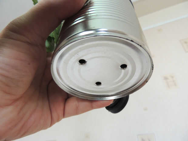 Perfore agujeros de tres (o más) en la parte inferior de la lata. Serán los drenes para el receptor del agua.