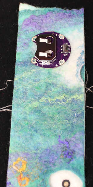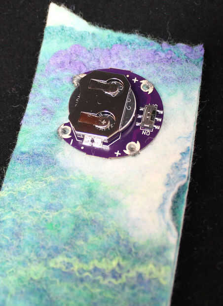 - Gire el fieltro de manera que el lado derecho quede hacia arriba y coloque el soporte de la batería con el + y - a los lados del titular de los correspondientes a la orientación de como colocaste los ánodos y cátodos en el otro lado. Traer un hilo hacia el otro lado, coser el portapilas con tres o cuatro puntadas a través de la + (o -, dependiendo de qué subproceso empezaste). Empujar la aguja a la parte posterior de la pulsera y un nudo. Coser unos puntos de funcionamiento para el segundo + o - perno, meter la aguja hacia el otro lado (derecho) y coser alrededor del perno segundo tres o cuatro veces. Ahora, meter la aguja en la parte posterior de la pulsera y ate. Corte el hilo cerca del nudo. Es importante mantener tensos los hilos conductores. Si están flojas, hay una mayor probabilidad de un cortocircuito, y que te haría triste.