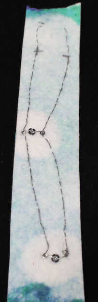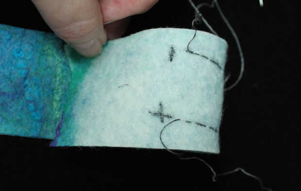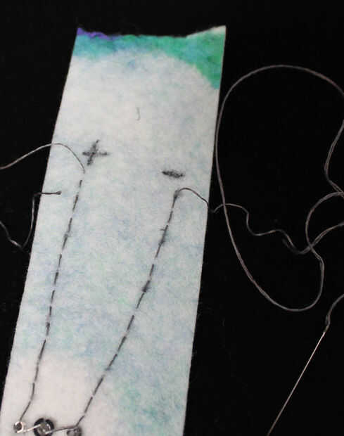 - Retire la aguja y el hilo, dejando una "cola". Más adelante utilizará este hilo para el soporte de la batería.