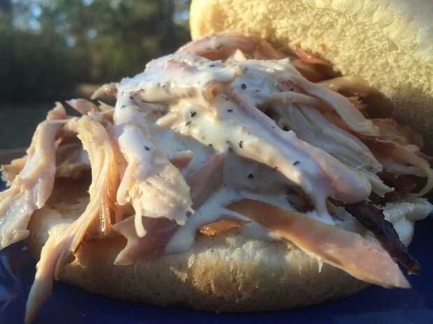 Pollo ahumado tirado es grande por sí mismo. Lo que esto hace que el sándwich de pollo tirado final es la combinación de la carne humeante con la brillante y picante Alabama salsa blanca.