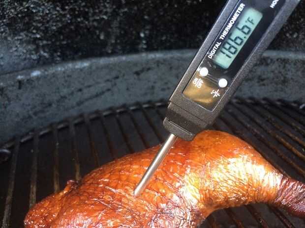 Después de 90 minutos levantar la tapa y colocar un termómetro digital en la parte del muslo del cuarto de pollo.