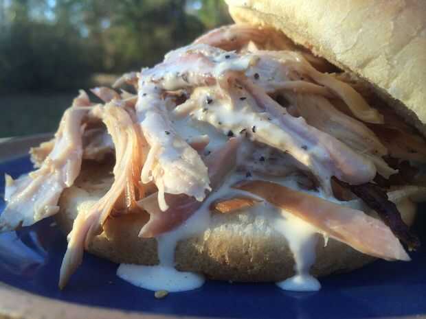 El sabor de la salmuera dulce y salado, madera humo y picante Alabama salsa blanca todos confluyen a crear el sándwich de pollo tirado Ultimate!
