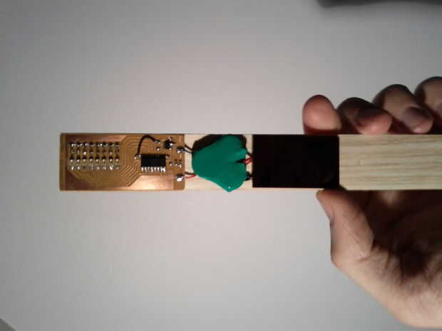 Soldadura de alimentación y tierra de la PCB realizados en las conexiones donde el LED utilizado para ir a la Junta de la antorcha, luego pegar el panel solar, el interruptor y la batería en su lugar.