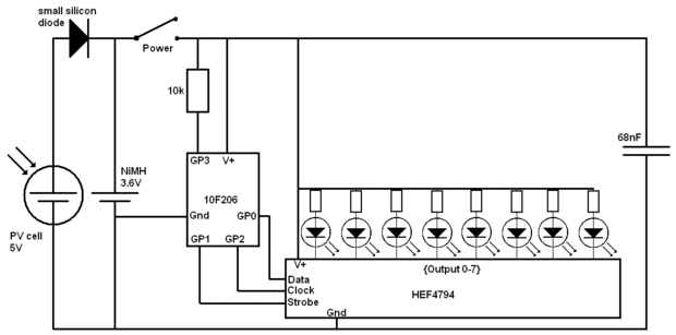 Las salidas PIC son conectadas a las entradas de luz estroboscópica, datos y reloj del registro de desplazamiento, y que sale de un pin PIC sin usar, que es tirado alto resistencia de 10 k.