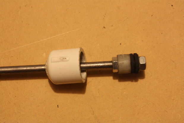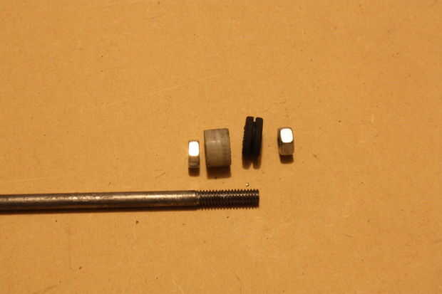 Tomar la varilla de 1/4 y 1/4 20 mueren y enrosque la varilla lo suficiente como para atornillar dos tuercas, el espaciador de nilón, arandela y arandela de plástico.