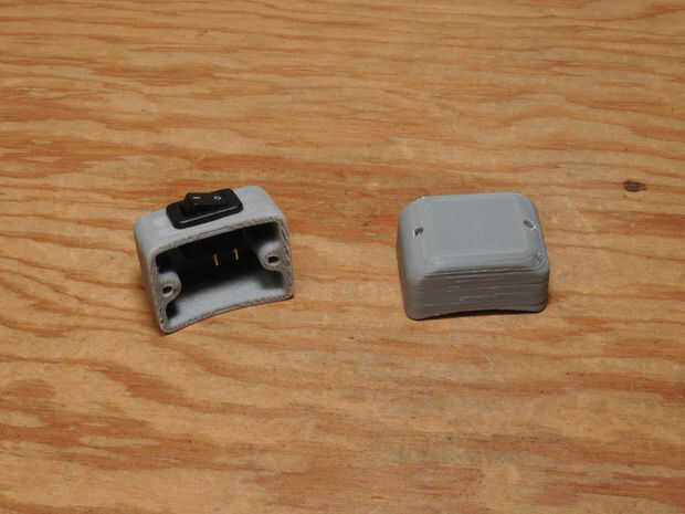 Imprimir dos copias de la caja del interruptor. En el Makerbot, les imprimí con ABS con 2 depósitos y el 80% de relleno. Este alto nivel de relleno es necesario porque la pieza debe ser perforado y golpeado ligeramente. Junto con el archivo STL, se incluye el archivo de Autodesk Inventor original.