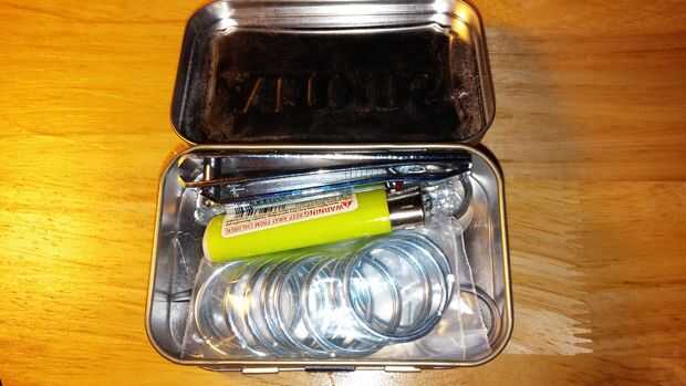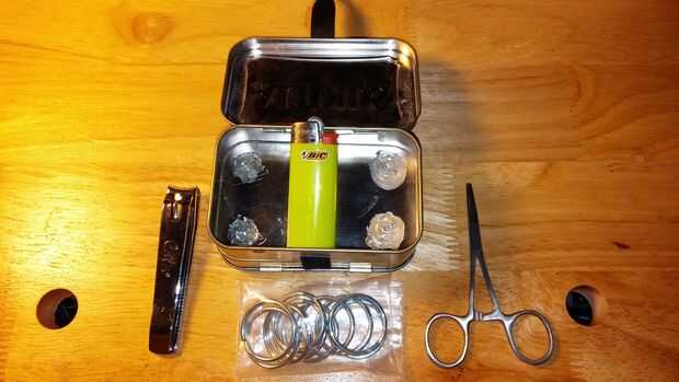 Como se puede ver, para empezar, pongo en un par de Cortaúñas para cortar el cordón, un pequeño par de pinzas hemostáticas, fuego y diez 10 llaveros. Todavía hay mucho espacio para algunas hebillas o un cuchillo real en lugar de los clippers con espacio de sobra.