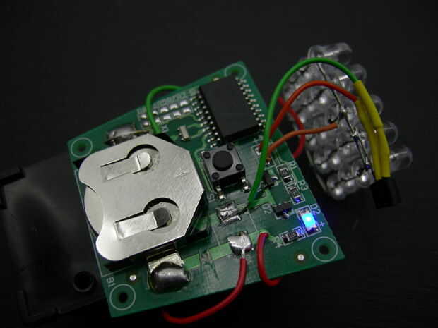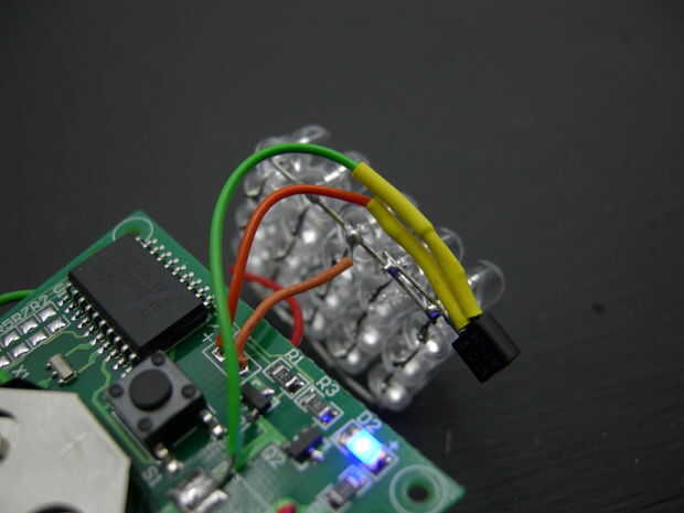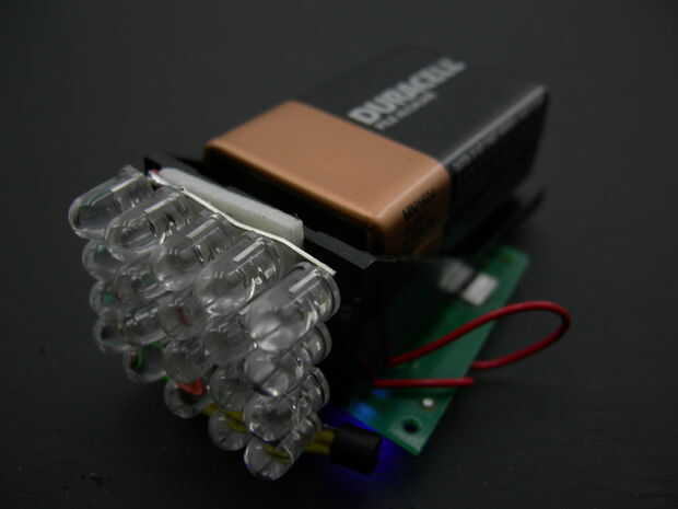 Ahora Conecte el lado positivo de los LEDs a la fuente de 9V. Finalmente, conecte los cables de tierra y 9V de la PCB al clip de batería de 9v. Conecte los LEDs y el PWB a clip de la batería. Usted puede utilizar cualquier cosa alrededor, cinta funcionará muy bien. Tenía algunos espuma dobles del palillo así usé. Fin.