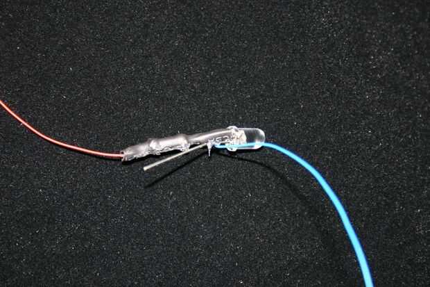 Agregar azul alambre de envoltura a la pata corta del LED.