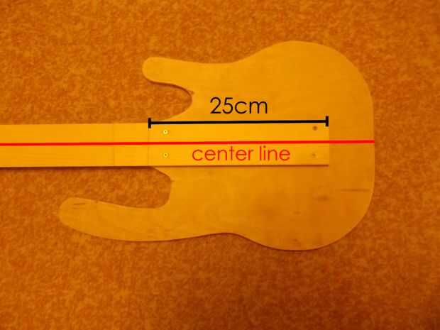 Ahora tienes que Monte fretboard. Así que toma un cuerpo, luego tomar tablón madera (90cm largo) y encajarlo que va a ser 25cm en el cuerpo y en el centro del cuerpo (como en la primera imagen). Después de tornillo en 4 tornillos.