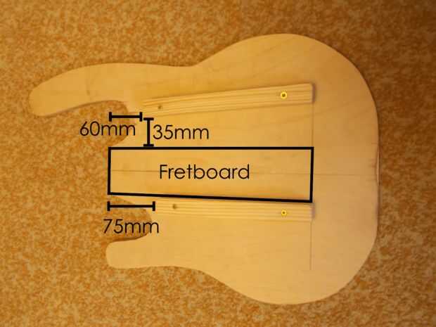 Tomar otro cuerpo. Tienes que añadir algunos bloques (tablón de madera de 2 cm x 2 cm) que se mantendrán una distancia entre dos cuerpos. Cortar dos bloques: 16cm y 19cm de largo. Una manzana (cerca de 16cm de largo) debe ser lo más cerca posible de los trastes (habrá Arduino y botones) y el otro debe ser en el otro lado del diapasón (este bloque debe tener 19cm de largo y debe ser paralela a los trastes. He hecho un error y mi bloque no paralelo). En la segunda imagen verás donde estará el diapasón cuando ponemos juntos dos cuerpos y todas las dimensiones que te ayudará a ajustar tus bloques de distancia.