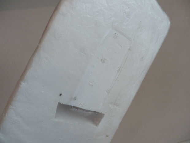 El agujero rectangular cortar el poliestireno base, que puede verse en la parte inferior del aerodeslizador, es sobre 80x20mm, éste es el conducto para que el aire entrar en la falda, hablando de que la falda es simplemente un pedazo de bolsa de plástico con todavía otro orificio rectangular en lo grande, el tamaño de este agujero no es importante , pero generalmente su mejor dejar 1/3 de la anchura de los aerodeslizadores, digno de la falda alrededor de todos los lados. la falda se une al aerodeslizador doblando los bordes de la lámina de plástico sobre en la parte superior del poliestireno (dejando un poco de holgura) y pegar abajo de ellos.