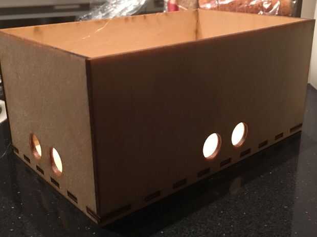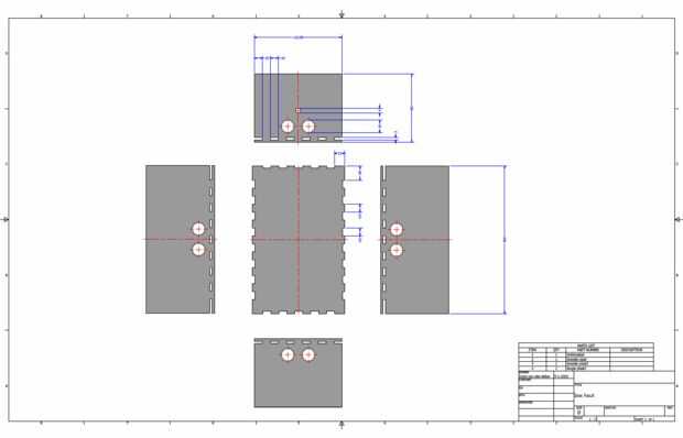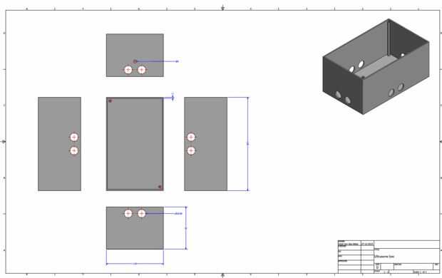 OM de caja te maken tenía ik een eerste instantie 3D printen en gedachten. Helaas bleek het te lang te duren om de caja uit te Kunnan printen (70 + uur) at fue de kans te groot dat dit fout zou gaan. OM de caja te Kunnan maken heb ik toen besloten om de caja uit houd te laten snijden. Hiervoor moesten de tekeningen sin embargo wel autorizada worden. De tekeningen hiervan zijn te zien op la foto 7. tekening completa es te zien en het pdf Tekeningen 2.