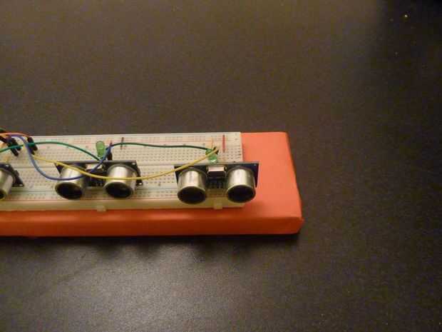 Un LED verde opcional fue conectado entre el pin 3 y 4 de cada detector ultrasónico - esto emana un pulso de luz que varía en brillo como los objetos son traídos cerca o lejos de ese detector. Este es el pulso el Edison medidas para determinar la distancia a cualquier objeto cerca del sensor.