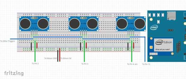Pin3 - este es el Pin eco - supervisado por Edison para determinar si un objeto está cercano, cada uno debe ir a un repuesto pin de entrada (pernos de 2 a 10)