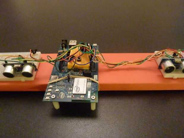 El microcontrolador de Edison se coloca cerca de la mitad y tres grandes breadboards y se unen por atrás son un poco de cinta adhesiva doble cara breadboards. La primera versión de este Piano ultrasónico tenía seis detectores Ultra-sconic - esta versión tiene nueve - usted puede tener tantos como tienen pasadores de repuesto en el Edison.