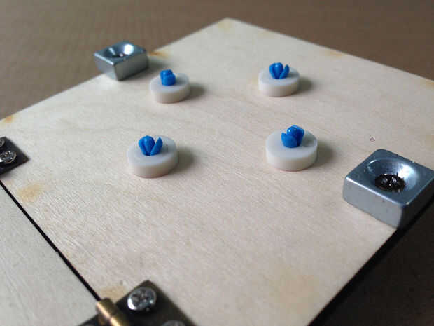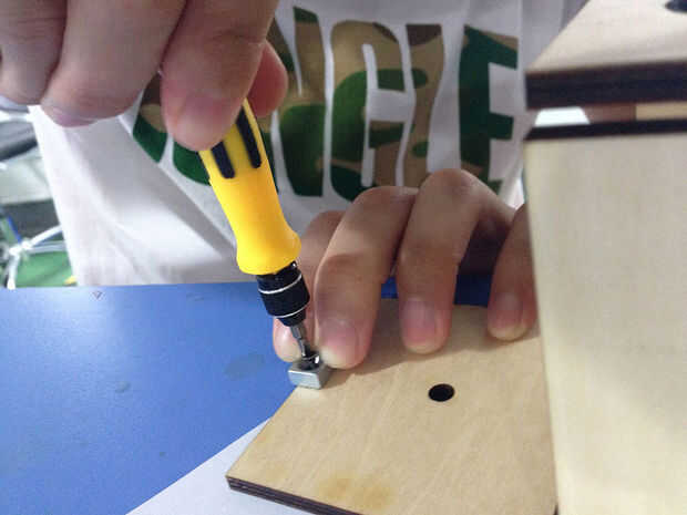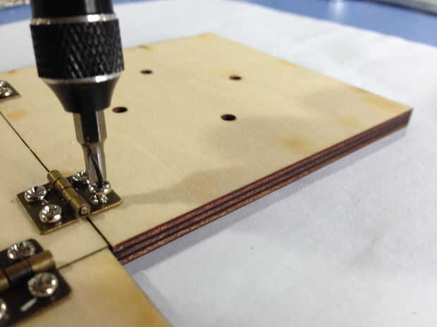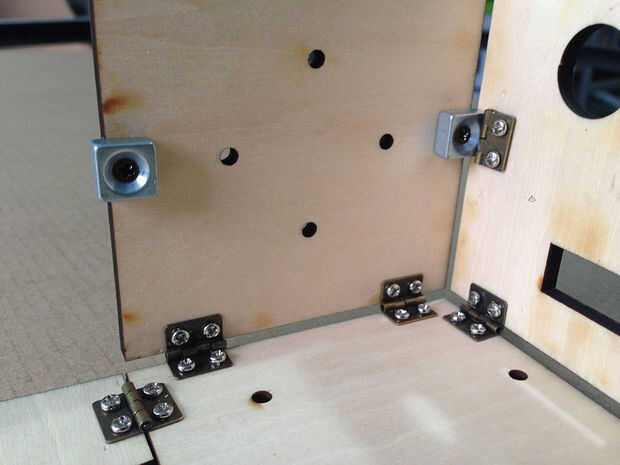Fije las bisagras e imanes con tornillos como se muestra en foto.
