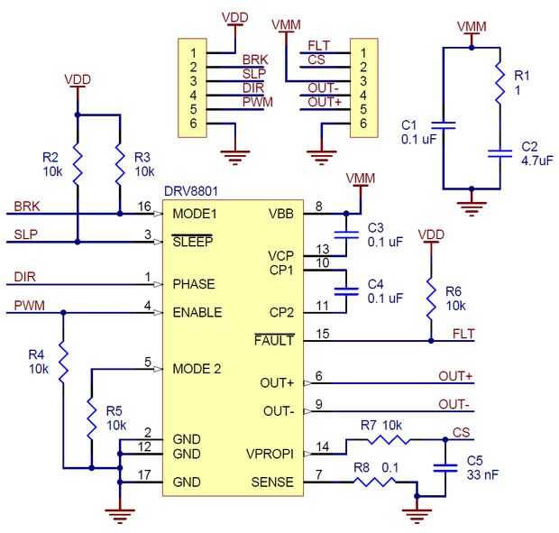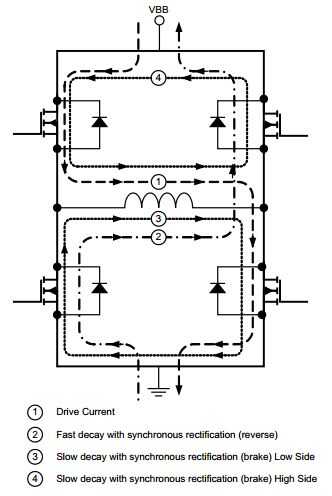 En su Texas Instruments hoja de datosse describen los principios de funcionamiento del componente DRV8801, recorta una imagen que muestra la trayectoria de la corriente, basada en la dirección seleccionada.