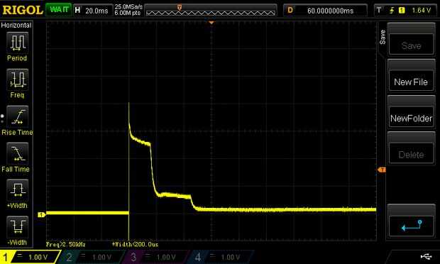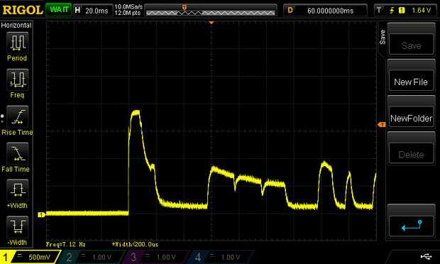 Tuvo una resistencia de 1,2 ohmios y ponerlo en serie con el cable de entrada negativo de robots. La medida tuvo que ser lado de baja presión, porque la sonda de tierra de alcance y el suelo de la PSU fueron conectados a través de la tierra. Por medición voltaje a través de un resistor de la serie de valor conocido, se puede calcular la corriente que fluye a través de ella, el consumo actual del robot en este caso. Tomó dos medidas, una con el paquete de baterías de iones de litio y uno con la fuente de alimentación, usted puede ver estos a este paso. El uno con el voltaje / la división en 1 [V] es la prueba con la batería, el otro con 500 [mV] por división es la fuente de alimentación. La batería tenía un voltaje menor que el valor de la PSU, y los convertidores DC-DC dibujar extra actual para mantener sus salidas reguladas: se puede ver un punto de [A] 4!