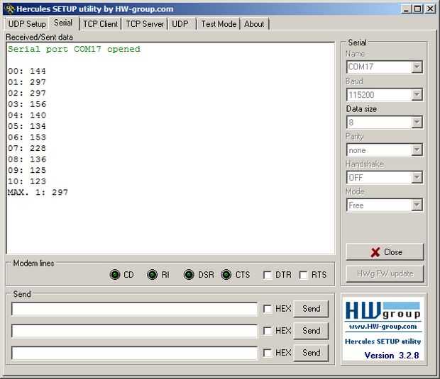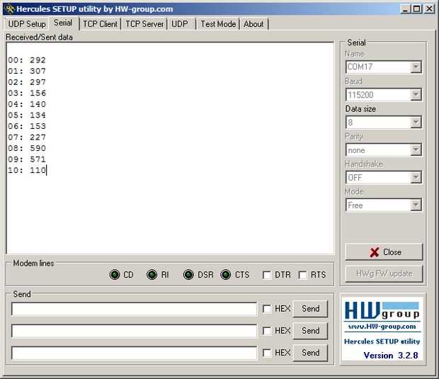 Después de terminar la configuración inicial, escribí algunas funciones comunes que sabía que necesita y ponerlo a prueba. El puerto serie, trabajado en el primer ensayo, mi mejor puerto de depuración fue listo para usar! Sólo necesitaba un programa de terminal para poder visualizar los datos enviado al PIC. Fácil: he descargado Hercules desde aquí: link.