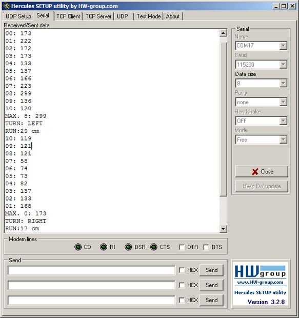 Después de el puerto serie ya en funcionamiento, mi vida llegó a ser diez veces más fácil. Cada variable, cada medida, todo lo que se escribe dentro de la foto llegó a ser accesible a través de este puerto de depuración. Rápidamente encontré que la variable que almacena el máximo de las mediciones de 11 distancia fue "unsigned char", pero algunas lecturas fueron más grandes de este tipo puede caber en, cambié a unsigned int con eso.