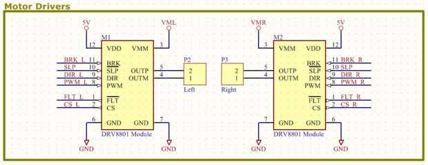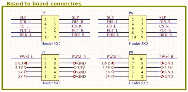 Los controladores de motor son realmente fábrica de tableros, dibujé símbolo y huella a la Junta, en vez de poner el puente en H IC por separado en mi tablero inferior. Son hechos por chipy puede suministrarse con un motor voltaje entre 8 [V] y 36 [V] (de ahí la necesidad de aumentadores de presión). Estas placas poco pueden ofrecer 1 corriente nominal [A] y 2,8 [A] corriente de pico. Cada pin I/O que este tablero tiene está de alguna manera conectado con el PIC para el control y eventual desarrollo futuro. Tal desarrollo sería leer nuevamente la corriente que fluye a través de los motores, por lo que uno les puede apagar en caso de pérdida de sustentación.