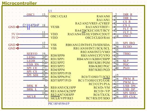 Es la unidad de control principal del proyecto, todas las redes, ya sea comentarios, señal de comunicación, pulsos, PWM - terminan aquí. Todos los pines de alimentación del PIC18F4550 deben conectados y desconectados con los condensadores [nF] 100. El pin VUSB debe ser desacoplado con 470 [nF], un valor recomendado en ficha técnica.