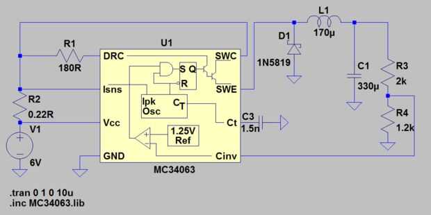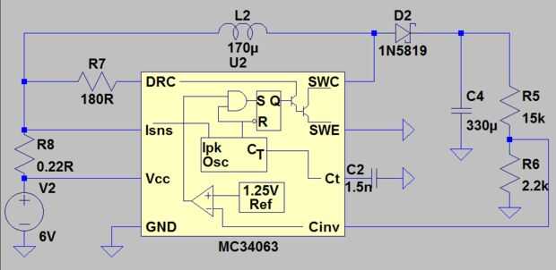 Estas no son diferentes uno del otro, sólo copia el esquema sugerido impulsar desde la hoja de datos del MC34063 y armar el esquema. También montado este pequeño esquema en LTSpice, quería ver si los rieles y los controles esquemáticos a aceptar, lo hicieron.